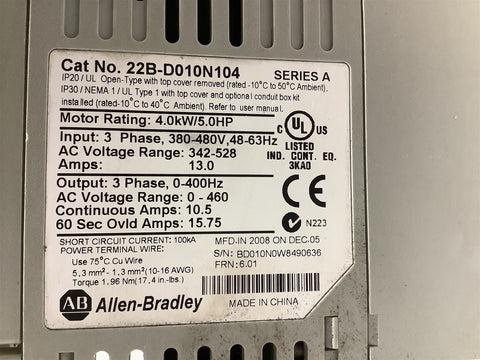 Allen-Bradley 22B-D010N104 5 Hp AC Drive 460 Volts Return Policy Returns accepted within 30 days. Items sold as is cannot be returned, unless description is in error. Buyer pays return freight. Shipping Policy We ship almost all items with 1 business day of cleared payment. We ship USPS and UPS. We can ship on your account. If you will be shipping freight, please be sure to provide all delivery contact information including a phone number. We will need to know if you have a fork lift or dock.