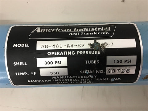 American Industrial AB-4101-A4-SP Heat Transfer 3000 PSI Shell 150 PSI Tubes Return Policy Returns accepted within 30 days. Items sold as is cannot be returned, unless description is in error. Buyer pays return freight. Shipping Policy We ship almost all items with 1 business day of cleared payment. We ship USPS and UPS. We can ship on your account. If you will be shipping freight, please be sure to provide all delivery contact information including a phone number. We will need to know if you have a fork lift or dock.