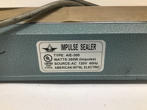 American International Electric AIE-300 Impulse Sealer 380 W 120 V 60 Hz Return Policy Returns accepted within 30 days. Items sold as is cannot be returned, unless description is in error. Buyer pays return freight. Shipping Policy We ship almost all items with 1 business day of cleared payment. We ship USPS and UPS. We can ship on your account. If you will be shipping freight, please be sure to provide all delivery contact information including a phone number. We will need to know if you have a fork lift or dock.