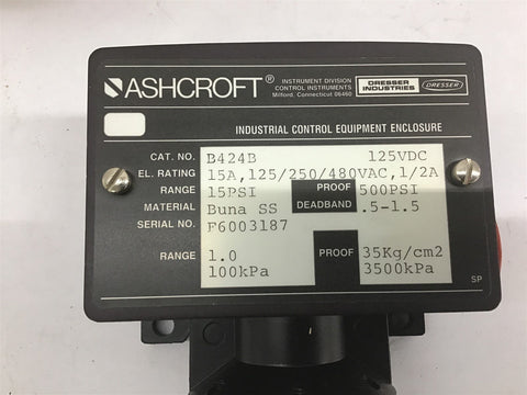 Ashcroft B424B Pressure Switch 15 Amp 125 Vac 15 Psi Return Policy Returns accepted within 30 days. Items sold as is cannot be returned, unless description is in error. Buyer pays return freight. Shipping Policy We ship almost all items with 1 business day of cleared payment. We ship USPS and UPS. We can ship on your account. If you will be shipping freight, please be sure to provide all delivery contact information including a phone number. We will need to know if you have a fork lift or dock.
