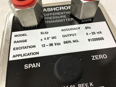 Ashcroft XLdp Range 1/2" WC Transmitter Output 4-20mA 12-36VDC