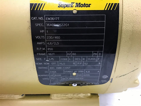 Baldor EM3617T 1 Hp AC Motor 230/460 volts 850 Rpm P 182T Frame Return Policy Returns accepted within 30 days. Items sold as is cannot be returned, unless description is in error. Buyer pays return freight. Shipping Policy We ship almost all items with 1 business day of cleared payment. We ship USPS and UPS. We can ship on your account. If you will be shipping freight, please be sure to provide all delivery contact information including a phone number. We will need to know if you have a fork lift or dock.