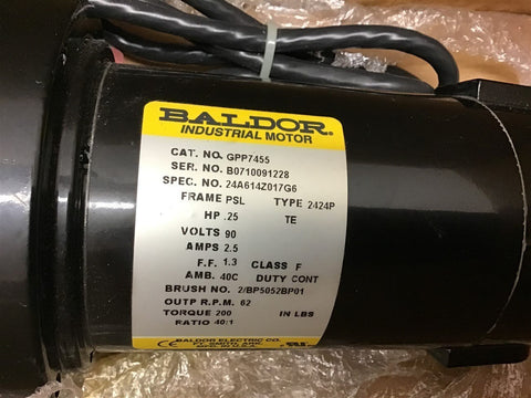 Baldor GPP7455 .25 HP DC Gear Motor 90 VDC 40:1 Ratio 62 Rpm Return Policy Returns accepted within 30 days. Items sold as is cannot be returned, unless description is in error. Buyer pays return freight. Shipping Policy We ship almost all items with 1 business day of cleared payment. We ship USPS and UPS. We can ship on your account. If you will be shipping freight, please be sure to provide all delivery contact information including a phone number. We will need to know if you have a fork lift or dock.
