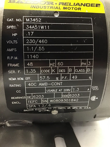 Baldor M3452 .17 Hp AC Motor 230/460 Volts 1140 Rpm 6P 48 Frame Return Policy Returns accepted within 30 days. Items sold as is cannot be returned, unless description is in error. Buyer pays return freight. Shipping Policy We ship almost all items with 1 business day of cleared payment. We ship USPS and UPS. We can ship on your account. If you will be shipping freight, please be sure to provide all delivery contact information including a phone number. We will need to know if you have a fork lift or dock.