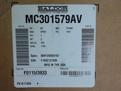 BALDOR, SPEC-36H120S501G1 3 HP, 230 VOLTS, 1725 RPM, 4P, 1-PH, 184T FR AC MOTOR Payment Policy Payment through PayPal or Contact Brooks Motor & Electric for Credit Card approval. Return Policy Returns accepted within 30 days. Items sold as is cannot be returned, unless description is in error. Buyer pays return freight. Shipping Policy We ship almost all items within 1 business day of cleared payment in the United States. We ship USPS, UPS, and Ebay Global Shipping Program. We can ship on your account only in the Unites States. If you will be shipping freight, please be sure to provide all delivery contact information including a phone number. We will need to know if you have a fork lift or dock. International shipments do not apply to this. Shipments will be handled through Ebay Global Shipping warehouse.