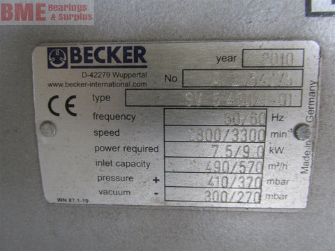 BECKER A 2454275 TYPE SV 5.490/1-01 RING COMPRESSOR BLOWER, 60HZ 3300 RPM, 9 KW