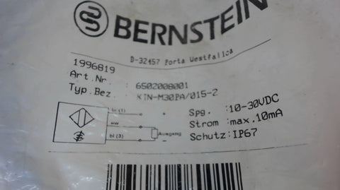 BERNSTEIN KIN-M30PA/015-2 PROXIMITY SENSOR, 10-30VDC, MAX 10MA Payment Policy Payment through PayPal or Contact Brooks Motor & Electric for Credit Card approval. Return Policy Returns accepted within 30 days. Items sold as is cannot be returned, unless description is in error. Buyer pays return freight. Shipping Policy We ship almost all items within 1 business day of cleared payment in the United States. We ship USPS, UPS, and Ebay Global Shipping Program. We can ship on your account only in the Unites States. If you will be shipping freight, please be sure to provide all delivery contact information including a phone number. We will need to know if you have a fork lift or dock. International shipments do not apply to this. Shipments will be handled through Ebay Global Shipping warehouse.