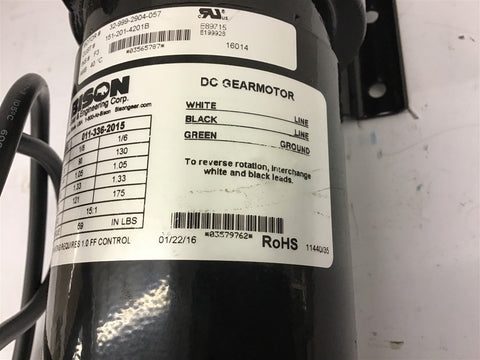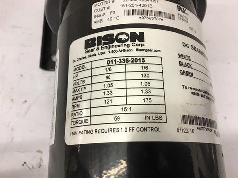 Bison 011-336-2015 1/8 HP DC Gear Motor 90 Volts 121 Rpm 15:1 Ratio Return Policy Returns accepted within 30 days. Items sold as is cannot be returned, unless description is in error. Buyer pays return freight. Shipping Policy We ship almost all items with 1 business day of cleared payment. We ship USPS and UPS. We can ship on your account. If you will be shipping freight, please be sure to provide all delivery contact information including a phone number. We will need to know if you have a fork lift or dock.