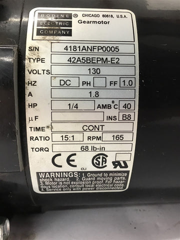 Bodine 42A5BEPM-E2 DC Gear Motor 130 Volts 1/4 HP 15:1 Ratio 165 Rpm Return Policy Returns accepted within 30 days. Items sold as is cannot be returned, unless description is in error. Buyer pays return freight. Shipping Policy We ship almost all items with 1 business day of cleared payment. We ship USPS and UPS. We can ship on your account. If you will be shipping freight, please be sure to provide all delivery contact information including a phone number. We will need to know if you have a fork lift or dock.