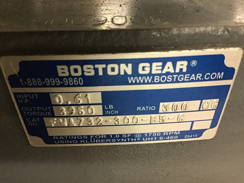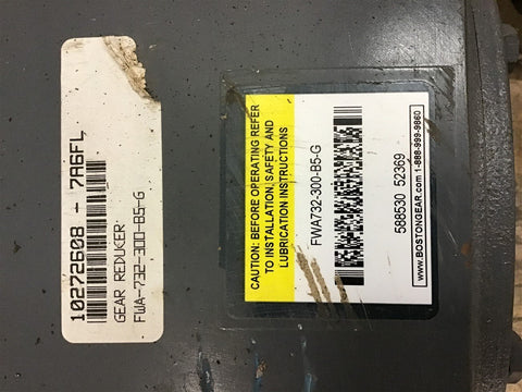 Boston FWA732-300-B5-G Double Reduction Gear Reducer 300 Ratio 0.61 Input HP Return Policy Returns accepted within 30 days. Items sold as is cannot be returned, unless description is in error. Buyer pays return freight. Shipping Policy We ship almost all items with 1 business day of cleared payment. We ship USPS and UPS. We can ship on your account. If you will be shipping freight, please be sure to provide all delivery contact information including a phone number. We will need to know if you have a fork lift or dock.