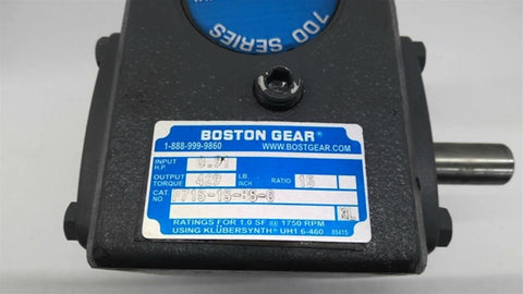 Boston Gear F715-15-B5-G Left Angle Gear Reducer 15:1 Ratio Input HP 0.91 Return Policy Returns accepted within 30 days. Items sold as is cannot be returned, unless description is in error. Buyer pays return freight. Shipping Policy We ship almost all items with 1 business day of cleared payment. We ship USPS and UPS. We can ship on your account. If you will be shipping freight, please be sure to provide all delivery contact information including a phone number. We will need to know if you have a fork lift or dock.