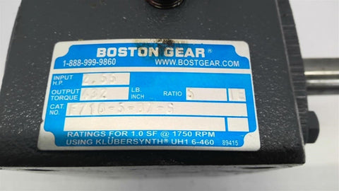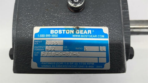Boston Gear F718-5-B7-G Left Angle Gear Reducer 5:1 Ratio Input HP 2.55 Return Policy Returns accepted within 30 days. Items sold as is cannot be returned, unless description is in error. Buyer pays return freight. Shipping Policy We ship almost all items with 1 business day of cleared payment. We ship USPS and UPS. We can ship on your account. If you will be shipping freight, please be sure to provide all delivery contact information including a phone number. We will need to know if you have a fork lift or dock.