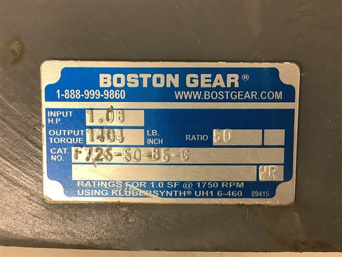 Boston Gear F726-50-B5-G Left Angle Gear Reducer 1.08 Input Hp 50:1 Ratio Return Policy Returns accepted within 30 days. Items sold as is cannot be returned, unless description is in error. Buyer pays return freight. Shipping Policy We ship almost all items with 1 business day of cleared payment. We ship USPS and UPS. We can ship on your account. If you will be shipping freight, please be sure to provide all delivery contact information including a phone number. We will need to know if you have a fork lift or dock.