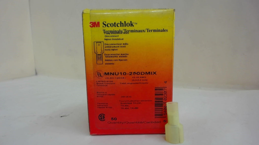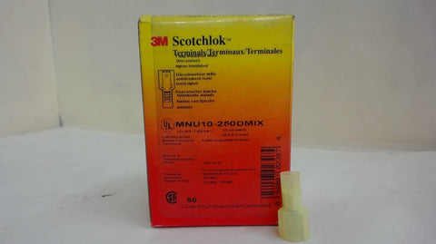 BOX OF ABOUT 50 SCOTCHLOK MNU10-250DMIX MALE DISCONNECT, 12-10 AWG