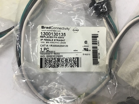 Brad Connectivity 1R3004A20A120 3P Female Straight Connector Cable 12" Lot Of 4 Return Policy Returns accepted within 30 days. Items sold as is cannot be returned, unless description is in error. Buyer pays return freight. Shipping Policy We ship almost all items with 1 business day of cleared payment. We ship USPS and UPS. We can ship on your account. If you will be shipping freight, please be sure to provide all delivery contact information including a phone number. We will need to know if you have a fork lift or dock.
