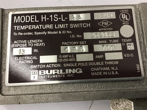 Burling H-1S-L-22 Temperature Limit Switch Return Policy Returns accepted within 30 days. Items sold as is cannot be returned, unless description is in error. Buyer pays return freight. Shipping Policy We ship almost all items with 1 business day of cleared payment. We ship USPS and UPS. We can ship on your account. If you will be shipping freight, please be sure to provide all delivery contact information including a phone number. We will need to know if you have a fork lift or dock.