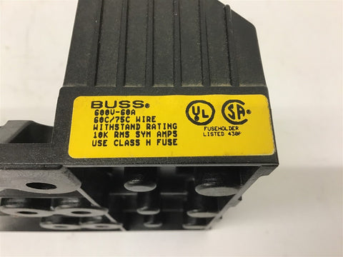 Buss H60060-3Cr FUSE Block 60 amp 600 Volts Return Policy Returns accepted within 30 days. Items sold as is cannot be returned, unless description is in error. Buyer pays return freight. Shipping Policy We ship almost all items with 1 business day of cleared payment. We ship USPS and UPS. We can ship on your account. If you will be shipping freight, please be sure to provide all delivery contact information including a phone number. We will need to know if you have a fork lift or dock.