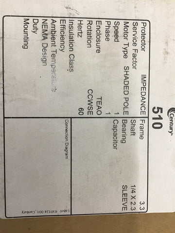 Century 510 1/70 Hp Shaded Pole Motor 115 V 1550 Rpm Return Policy Returns accepted within 30 days. Items sold as is cannot be returned, unless description is in error. Buyer pays return freight. Shipping Policy We ship almost all items with 1 business day of cleared payment. We ship USPS and UPS. We can ship on your account. If you will be shipping freight, please be sure to provide all delivery contact information including a phone number. We will need to know if you have a fork lift or dock.