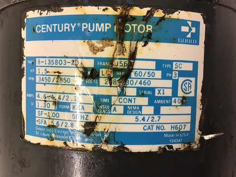 Century 8-135803-20 1 1/2 HP AC Motor 208-230/460 Volts 3600 rpm 2P 56 Frame Return Policy Returns accepted within 30 days. Items sold as is cannot be returned, unless description is in error. Buyer pays return freight. Shipping Policy We ship almost all items with 1 business day of cleared payment. We ship USPS and UPS. We can ship on your account. If you will be shipping freight, please be sure to provide all delivery contact information including a phone number. We will need to know if you have a fork lift or dock.