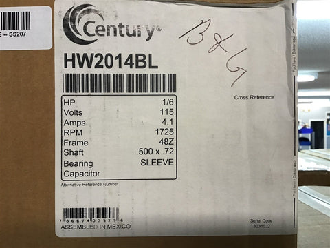 Century HW2014BL 1/6 HP AC Motor 115 Volts 1725 Rpm 48Z Frame Return Policy Returns accepted within 30 days. Items sold as is cannot be returned, unless description is in error. Buyer pays return freight. Shipping Policy We ship almost all items with 1 business day of cleared payment. We ship USPS and UPS. We can ship on your account. If you will be shipping freight, please be sure to provide all delivery contact information including a phone number. We will need to know if you have a fork lift or dock.