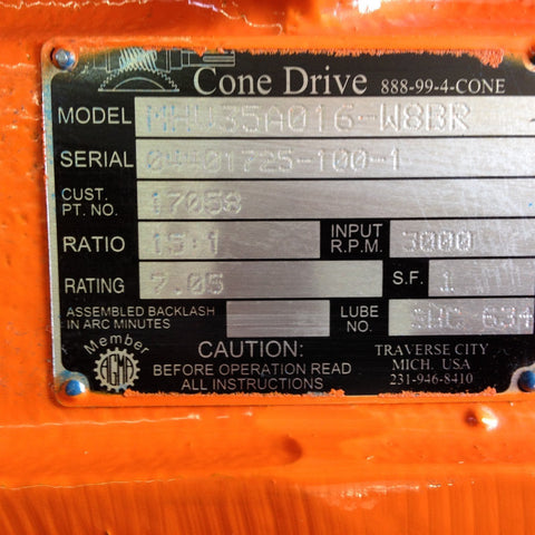 Cone Drive -- Mru35A016-W8Br -- 15:1 Ratio -- 7.05 Hp Rating -- 3000 Input Rpm