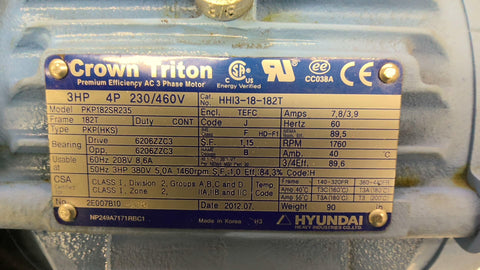 Crown Triton PKP182SR235 3Hp Ac Motor 1800Rpm 4P 3Ph 182T 230/460V Tefc 60Hz