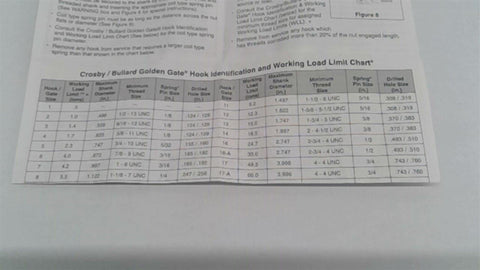 4.2 Working Load,----.997" Max Shank Diameter,---- 1-8 UNC Min Thread Size,---- 3/16" ---Spring Pin, ----.185/.192" Drilled Hole Size,17 Hook/Gate ,---- 49.5 Ton Working Load Limit,---- 3.996"Max Shank Diameter, ----4-4UNC Minimum Thread Size,---- 3/4" Spring Pin----.743/.760" Drilled Hole Size----New Surplus--Opened Factory Package---10/23/JLV
