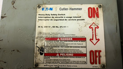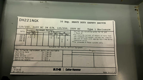 Culter-Hammer DH221NGK 30A 240V 60HZ Safety Switch Return Policy Returns accepted within 30 days. Items sold as is cannot be returned, unless description is in error. Buyer pays return freight. Shipping Policy We ship almost all items with 1 business day of cleared payment. We ship USPS and UPS. We can ship on your account. If you will be shipping freight, please be sure to provide all delivery contact information including a phone number. We will need to know if you have a fork lift or dock.
