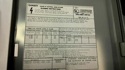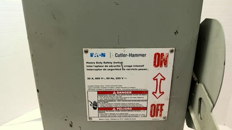 Culter-Hammer DH361UGK 30A 600V 60HZ Safety Switch Type 1 Return Policy Returns accepted within 30 days. Items sold as is cannot be returned, unless description is in error. Buyer pays return freight. Shipping Policy We ship almost all items with 1 business day of cleared payment. We ship USPS and UPS. We can ship on your account. If you will be shipping freight, please be sure to provide all delivery contact information including a phone number. We will need to know if you have a fork lift or dock.