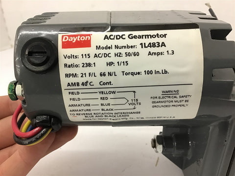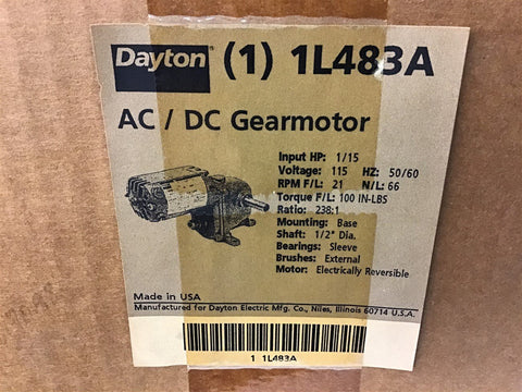 Dayton 1L483A 1/15 HP AC/DC Gearmotor 115 V 238:1 Ratio 21 RPM Return Policy Returns accepted within 30 days. Items sold as is cannot be returned, unless description is in error. Buyer pays return freight. Shipping Policy We ship almost all items with 1 business day of cleared payment. We ship USPS and UPS. We can ship on your account. If you will be shipping freight, please be sure to provide all delivery contact information including a phone number. We will need to know if you have a fork lift or dock.