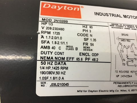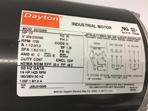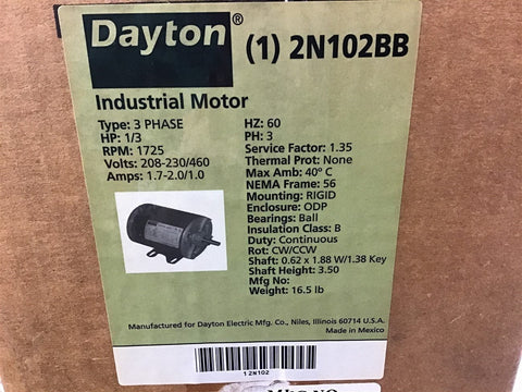Dayton 2N102BB 1/3 HP AC Motor 208-230/460 volts 1725 rpm 56 Frame Return Policy Returns accepted within 30 days. Items sold as is cannot be returned, unless description is in error. Buyer pays return freight. Shipping Policy We ship almost all items with 1 business day of cleared payment. We ship USPS and UPS. We can ship on your account. If you will be shipping freight, please be sure to provide all delivery contact information including a phone number. We will need to know if you have a fork lift or dock.