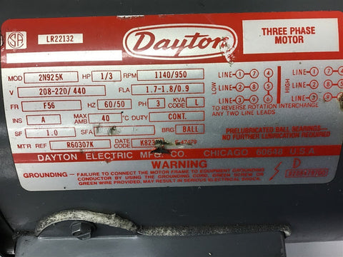 Dayton 2N925K 1/3 Hp AC Motor 208-220/440 volts 1140 Rpm 56 Frame Return Policy Returns accepted within 30 days. Items sold as is cannot be returned, unless description is in error. Buyer pays return freight. Shipping Policy We ship almost all items with 1 business day of cleared payment. We ship USPS and UPS. We can ship on your account. If you will be shipping freight, please be sure to provide all delivery contact information including a phone number. We will need to know if you have a fork lift or dock.