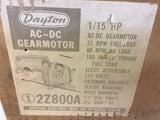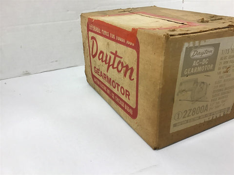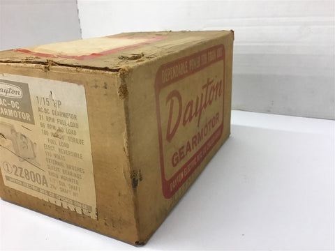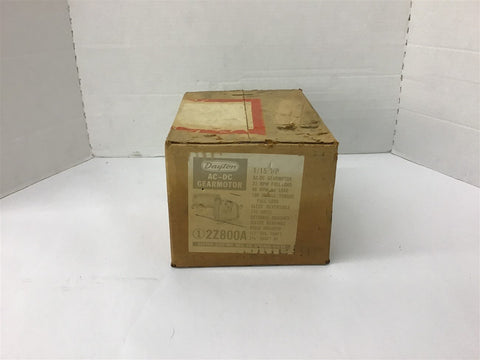 Dayton 2Z800A 1/15 Hp AC-DC Gearmotor 21 RPM 115 Volts Return Policy Returns accepted within 30 days. Items sold as is cannot be returned, unless description is in error. Buyer pays return freight. Shipping Policy We ship almost all items with 1 business day of cleared payment. We ship USPS and UPS. We can ship on your account. If you will be shipping freight, please be sure to provide all delivery contact information including a phone number. We will need to know if you have a fork lift or dock.