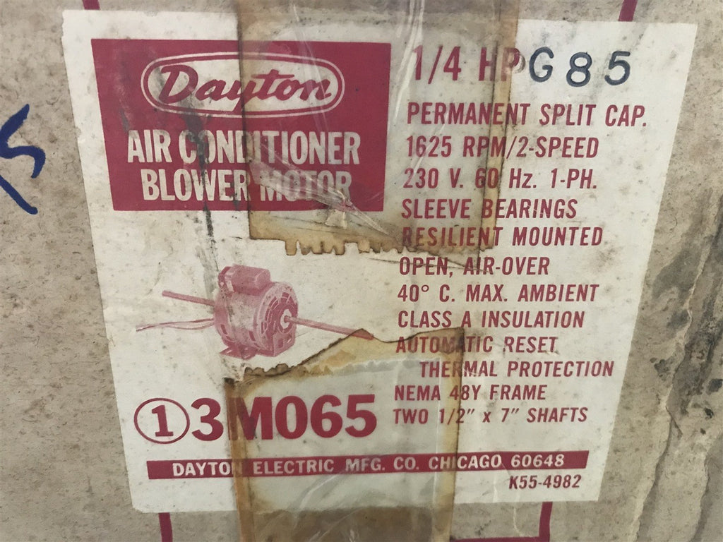 DAYTON 3M065 HEAT/COOL MOTOR 1/4 HP 230V 60Hz PH 1 Return Policy Returns accepted within 30 days. Items sold as is cannot be returned, unless description is in error. Buyer pays return freight. Shipping Policy We ship almost all items with 1 business day of cleared payment. We ship USPS and UPS. We can ship on your account. If you will be shipping freight, please be sure to provide all delivery contact information including a phone number. We will need to know if you have a fork lift or dock.