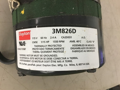 Dayton 3M826D 1/15 HP AC Motor 1550 Rpm 115 Volt 2.4 amp Return Policy Returns accepted within 30 days. Items sold as is cannot be returned, unless description is in error. Buyer pays return freight. Shipping Policy We ship almost all items with 1 business day of cleared payment. We ship USPS and UPS. We can ship on your account. If you will be shipping freight, please be sure to provide all delivery contact information including a phone number. We will need to know if you have a fork lift or dock.