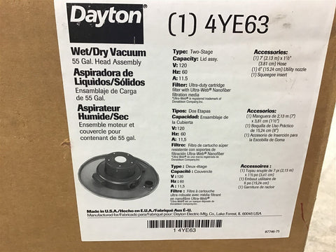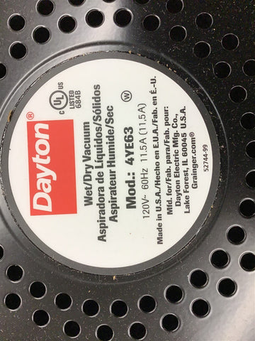 Dayton 4YE63 Wet/Dry Vacuum 55 Gal Head Assembly 120 Volts Return Policy Returns accepted within 30 days. Items sold as is cannot be returned, unless description is in error. Buyer pays return freight. Shipping Policy We ship almost all items with 1 business day of cleared payment. We ship USPS and UPS. We can ship on your account. If you will be shipping freight, please be sure to provide all delivery contact information including a phone number. We will need to know if you have a fork lift or dock.