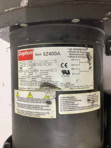 Dayton 6Z400A AC Gear Motor 1/4HP W/ Dayton 4Z447A Magnetic Disc Brake Return Policy Returns accepted within 30 days. Items sold as is cannot be returned, unless description is in error. Buyer pays return freight. Shipping Policy We ship almost all items with 1 business day of cleared payment. We ship USPS and UPS. We can ship on your account. If you will be shipping freight, please be sure to provide all delivery contact information including a phone number. We will need to know if you have a fork lift or dock.