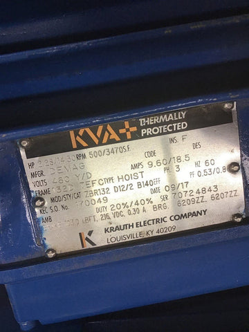 Demag ZBR132 D12/2 B140 Hoist Motor 2.28/14.3 HP 500/3470 RPM 460 Volt 132D Return Policy Returns accepted within 30 days. Items sold as is cannot be returned, unless description is in error. Buyer pays return freight. Shipping Policy We ship almost all items with 1 business day of cleared payment. We ship USPS and UPS. We can ship on your account. If you will be shipping freight, please be sure to provide all delivery contact information including a phone number. We will need to know if you have a fork lift or dock.