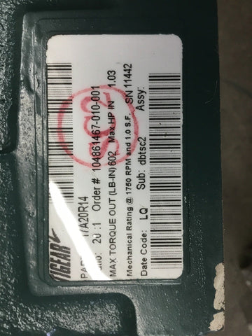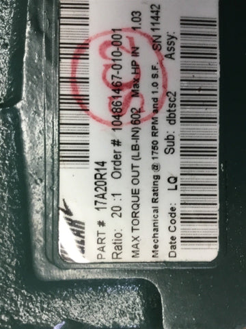DODGE TIGEAR 17A20R14 20:1 RATIO, RIGHT ANGLE GEAR REDUCER 1.03 INPUT HP