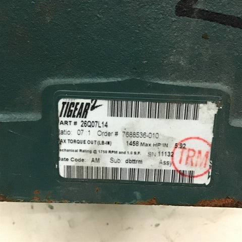 Dodge tigear 26Q07L14 7:1 Ratio Left Angle Gear Reducer 5.92 Input Hp Return Policy Returns accepted within 30 days. Items sold as is cannot be returned, unless description is in error. Buyer pays return freight. Shipping Policy We ship almost all items with 1 business day of cleared payment. We ship USPS and UPS. We can ship on your account. If you will be shipping freight, please be sure to provide all delivery contact information including a phone number. We will need to know if you have a fork lift or dock.