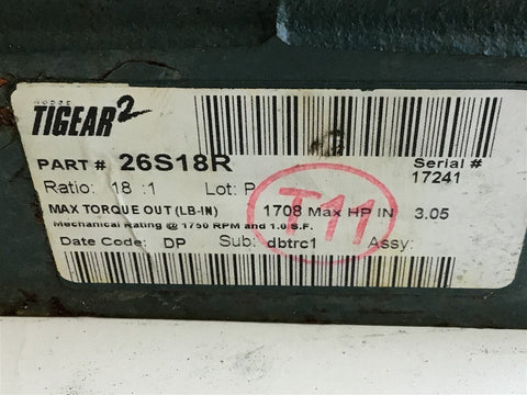 Dodge Tigear 26S18R Right angle Gear Reducer 18:1 Ratio 3.05 Input HP