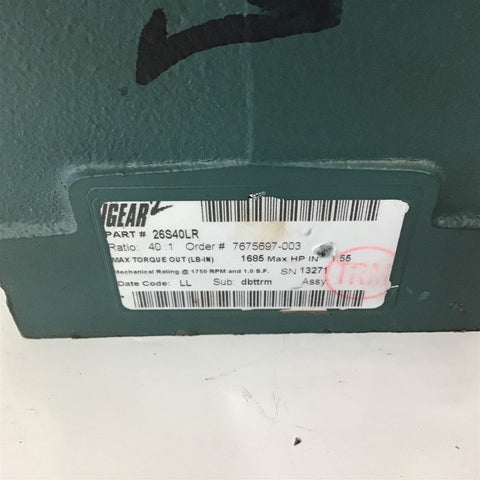 Dodge Tigear 26S40LR 40:1 Ratio 1.55 Input Hp Left / Right Angle Gear Reducer Return Policy Returns accepted within 30 days. Items sold as is cannot be returned, unless description is in error. Buyer pays return freight. Shipping Policy We ship almost all items with 1 business day of cleared payment. We ship USPS and UPS. We can ship on your account. If you will be shipping freight, please be sure to provide all delivery contact information including a phone number. We will need to know if you have a fork lift or dock.