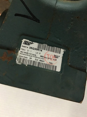 DODGE TIGEAR 35Q30R14 RIGHT ANGLE GEAR REDUCER 30:1 RATIO 0.85" IN 1.5" OUT Return Policy Returns accepted within 30 days. Items sold as is cannot be returned, unless description is in error. Buyer pays return freight. Shipping Policy We ship almost all items with 1 business day of cleared payment. We ship USPS and UPS. We can ship on your account. If you will be shipping freight, please be sure to provide all delivery contact information including a phone number. We will need to know if you have a fork lift or dock.