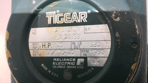 Dodge Tigear 7915121 AV Left Angle Gear Reducer Ratio 20:1 Input HP 1.0 Return Policy Returns accepted within 30 days. Items sold as is cannot be returned, unless description is in error. Buyer pays return freight. Shipping Policy We ship almost all items with 1 business day of cleared payment. We ship USPS and UPS. We can ship on your account. If you will be shipping freight, please be sure to provide all delivery contact information including a phone number. We will need to know if you have a fork lift or dock.