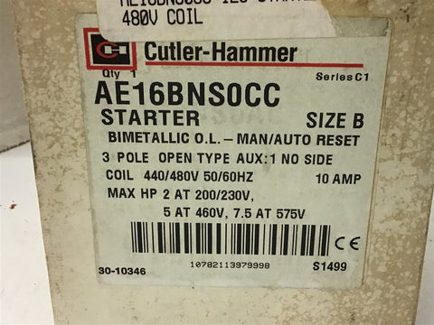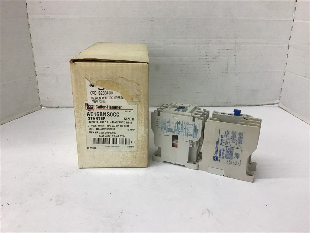 Eaton AE16BNS0CC Size B Starter 5 Hp @ 460 volts 440/480 Volt Coil 3 Pole 10 Amp Return Policy Returns accepted within 30 days. Items sold as is cannot be returned, unless description is in error. Buyer pays return freight. Shipping Policy We ship almost all items with 1 business day of cleared payment. We ship USPS and UPS. We can ship on your account. If you will be shipping freight, please be sure to provide all delivery contact information including a phone number. We will need to know if you have a fork lift or dock.