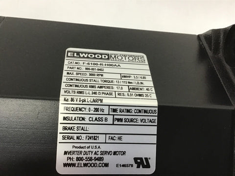 Elwood Motors F-6100-R-H00AA AC Servo Motor 4.69HP 3000RPM 13/115Nm/LB" 3PH Return Policy Returns accepted within 30 days. Items sold as is cannot be returned, unless description is in error. Buyer pays return freight. Shipping Policy We ship almost all items with 1 business day of cleared payment. We ship USPS and UPS. We can ship on your account. If you will be shipping freight, please be sure to provide all delivery contact information including a phone number. We will need to know if you have a fork lift or dock.