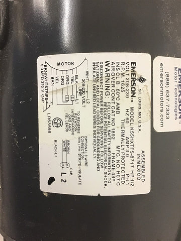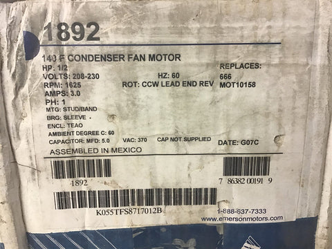 Emerson 1892 1/2 HP Condenser Fan motor 208-230 V 1625 Rpm Single Phase Return Policy Returns accepted within 30 days. Items sold as is cannot be returned, unless description is in error. Buyer pays return freight. Shipping Policy We ship almost all items with 1 business day of cleared payment. We ship USPS and UPS. We can ship on your account. If you will be shipping freight, please be sure to provide all delivery contact information including a phone number. We will need to know if you have a fork lift or dock.
