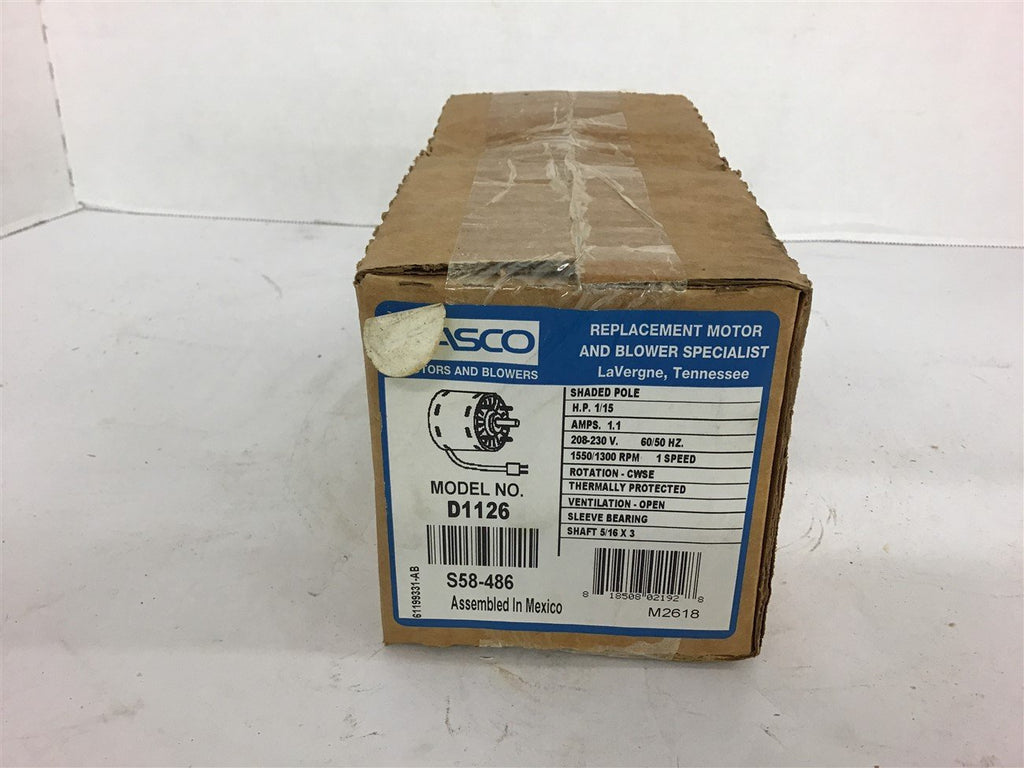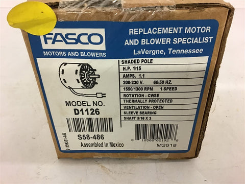 Fasco D1126 1/15 Hp Motor 208-230 votls 1550/1300 Rpm 1 Speed Return Policy Returns accepted within 30 days. Items sold as is cannot be returned, unless description is in error. Buyer pays return freight. Shipping Policy We ship almost all items with 1 business day of cleared payment. We ship USPS and UPS. We can ship on your account. If you will be shipping freight, please be sure to provide all delivery contact information including a phone number. We will need to know if you have a fork lift or dock.