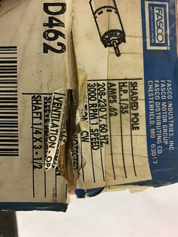 Fasco D462 1/35 Hp Motor 208-230 volts 3000 Rpm 1 Speed .62 amps Return Policy Returns accepted within 30 days. Items sold as is cannot be returned, unless description is in error. Buyer pays return freight. Shipping Policy We ship almost all items with 1 business day of cleared payment. We ship USPS and UPS. We can ship on your account. If you will be shipping freight, please be sure to provide all delivery contact information including a phone number. We will need to know if you have a fork lift or dock.