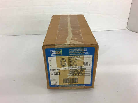 Fasco D603 1/50 Hp Facn Motor 115 Volts 1500 Rpm Single Speed Return Policy Returns accepted within 30 days. Items sold as is cannot be returned, unless description is in error. Buyer pays return freight. Shipping Policy We ship almost all items with 1 business day of cleared payment. We ship USPS and UPS. We can ship on your account. If you will be shipping freight, please be sure to provide all delivery contact information including a phone number. We will need to know if you have a fork lift or dock.